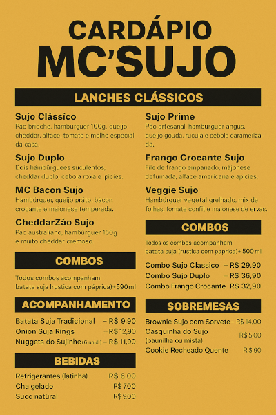 O MC'SUJO é uma hamburgueria fictícia com uma proposta irreverente, urbana e ousada. Criada para romper com os padrões tradicionais das redes de fast-food, a marca aposta no humor ácido e no visual “sujo no nome, limpo na execução”, oferecendo comida de qualidade com muito sabor e autenticidade.